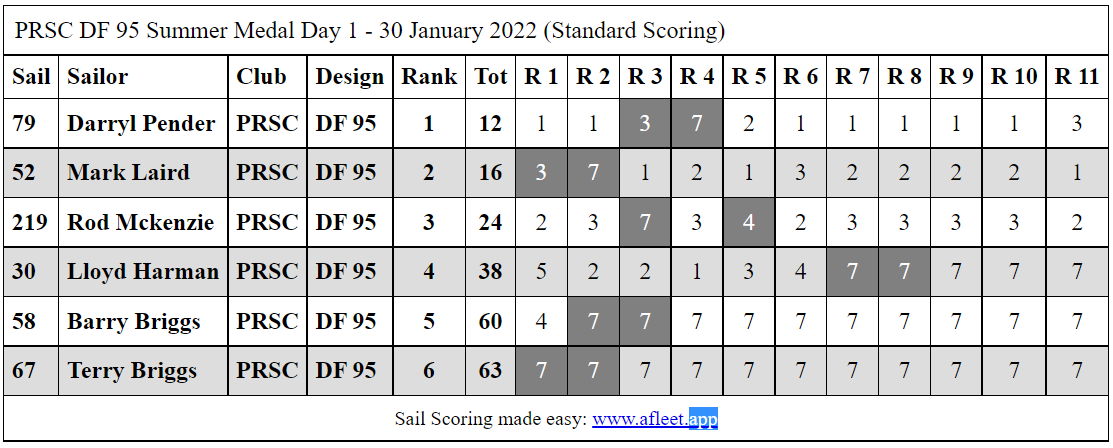 Congratulations to Darryl (DF 79) for overall first in the DF95s and to Clyde (NZL 03) for pulling off the IOM win against strong opposition.